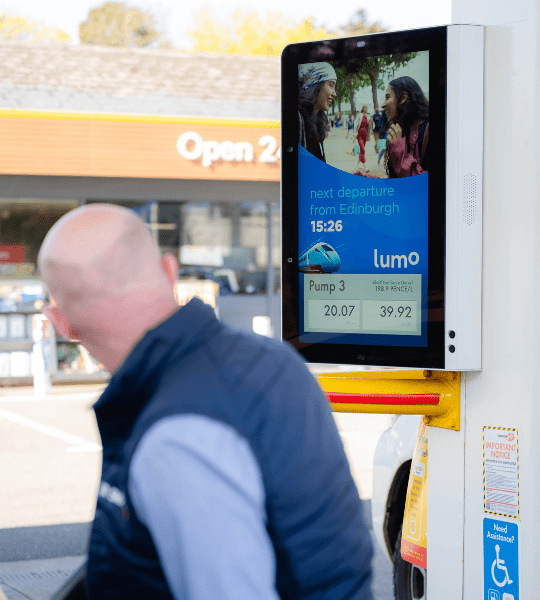 The initiative will see screens positioned at fuel pumps across selected locations, showing upcoming Lumo departures and fares on routes initially in Edinburgh offering motorists a timely reminder of a greener, often more affordable alternative.