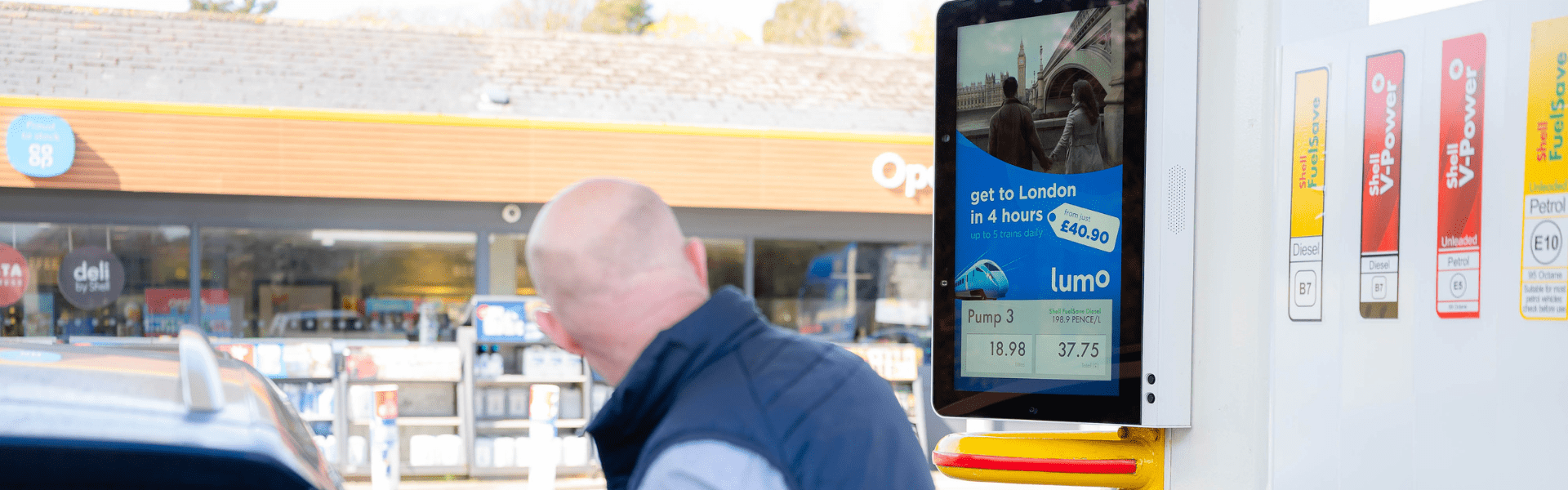 Petrol station screens prompt drivers with live Lumo rail fares and departures.